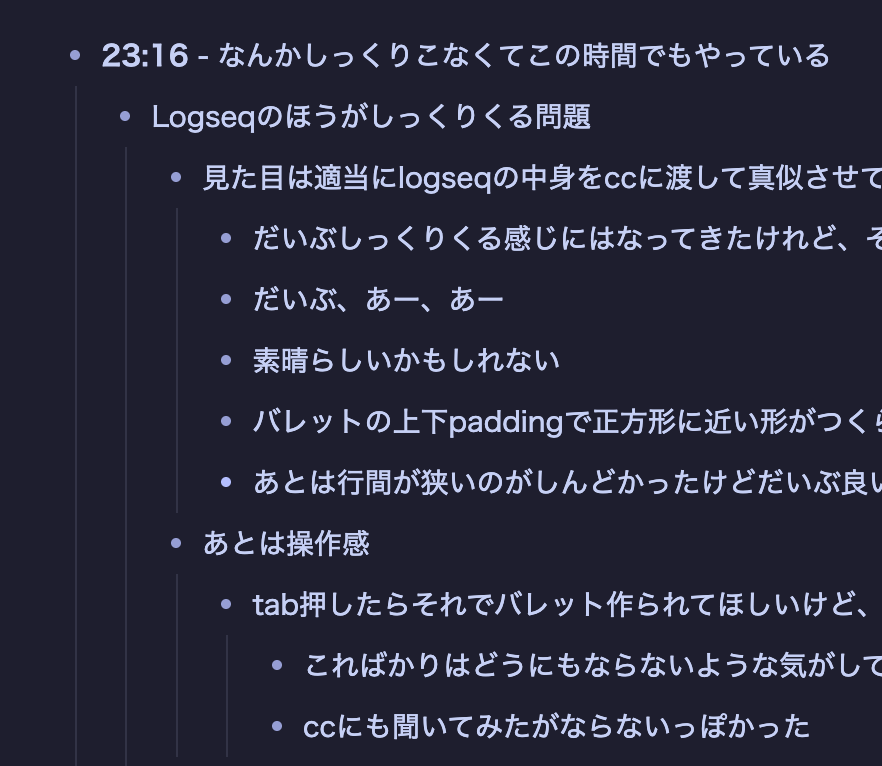 Obsidian Outliner、バレットと行頭の間が近すぎたり、行間狭かったり、とにかくしっくり来てなかったので、LogseqのHTMLとCSSとスクショをClaude Codeに読ませて真似させたらだいぶ良い感じになった。ホント雑に理想を実現できる……